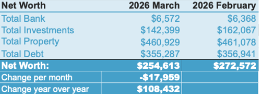 March was a reminder that investing is not always a smooth ride. In fact, it can be quite the opposite. During the month, we experienced our second largest monthly decline in net worth. This was driven by increased volatility across global markets. Because our portfolio is positioned aggressively for long-term growth, we felt that volatility more than a conservative portfolio would. Even with continued contributions to our retirement accounts, our overall investments declined by about 12%.